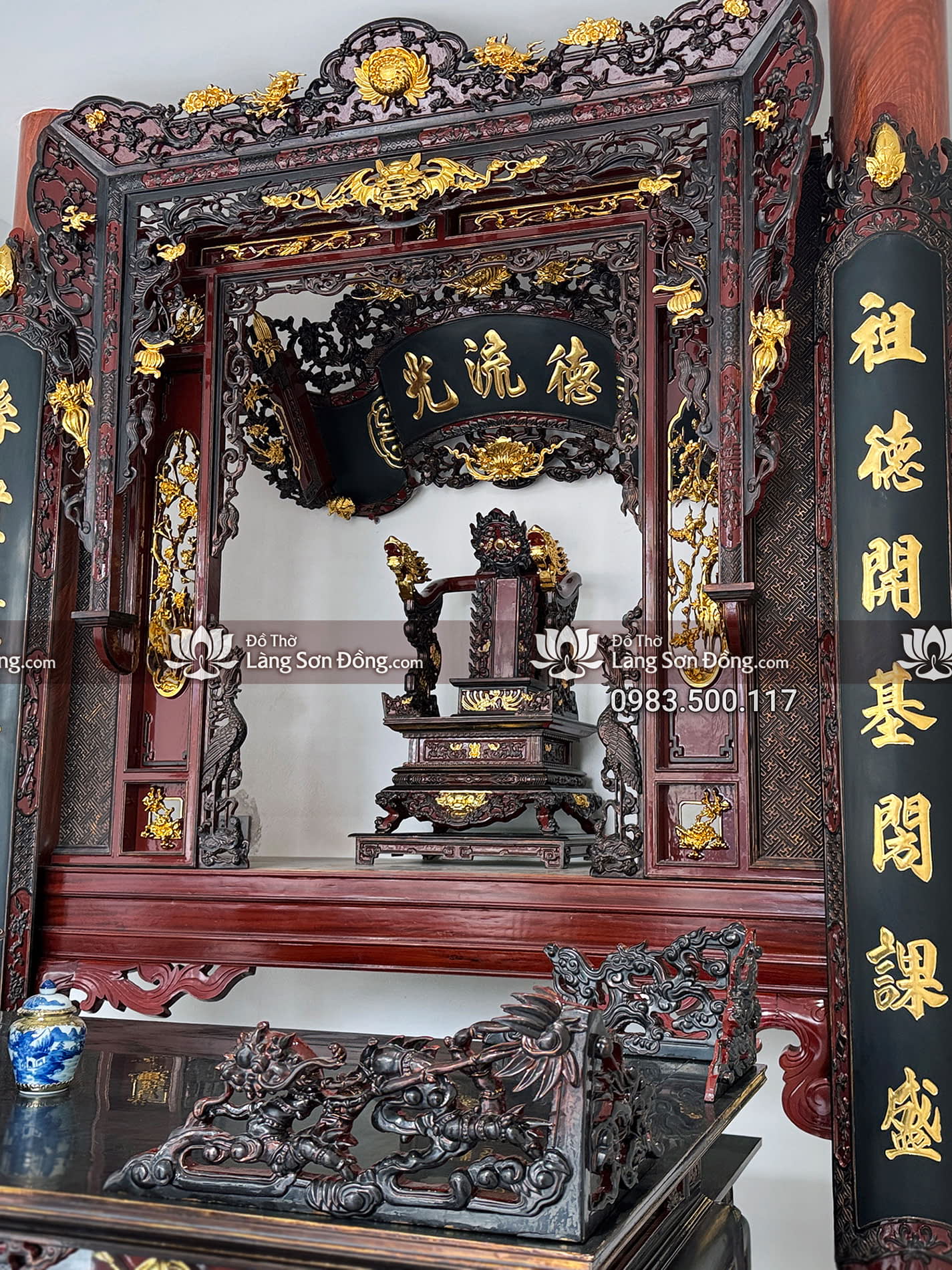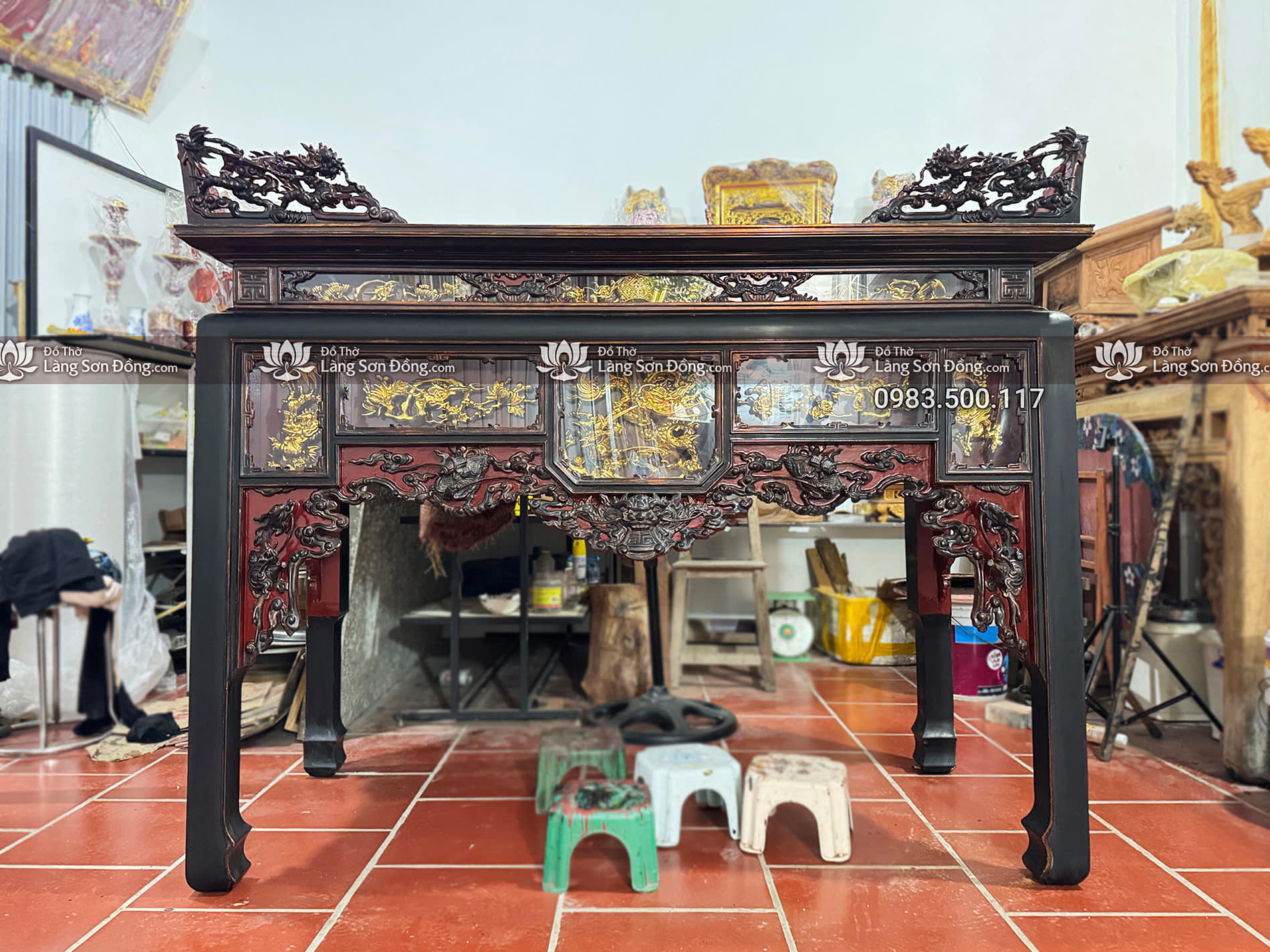 Tổng quan công việc Tên sản phẩm: Phòng thờ tư gia, bao gồm: Bàn thờ Ô Xa, Thiều châu, Cuốn thư Câu đối, Ngai vách, bàn Thực. Địa điểm nhận: Cát Quế, Hà Nội. Chất liệu sử dụng: Gỗ Dổi. Hình thức sơn: Sơn thếp giả cổ. Tình trạng: Đang vào sơn. Chi phí: Liên [...]